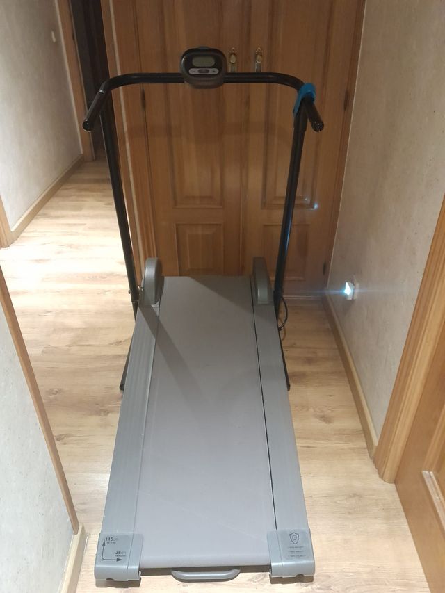 Detalles del productoCinta de correr gris, ideal para mantenerte activo en casa. Su diseño plegable facilita su almacenamiento.