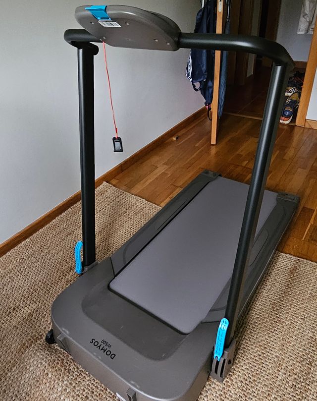 Detalles del productoCinta de correr DOMYOS W500 en color gris, con diseño plegable para facilitar su almacenamiento. Incluye sistema de seguridad con cordón.