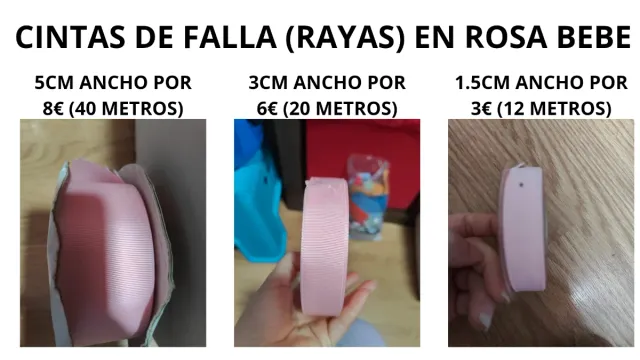 Detalles del productoCintas de falla con diseño de rayas en color rosa bebé, disponibles en varios anchos y metrajes.
