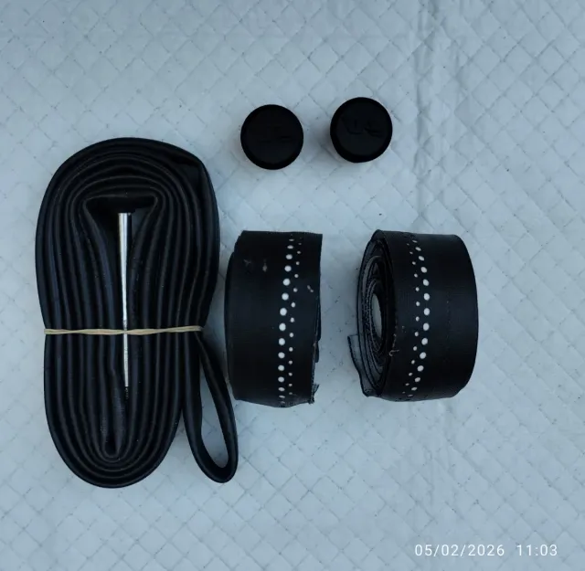 Detalles del productoSet de cinta de manillar para bicicleta en color negro, con detalles de puntos blancos. Incluye dos tapones negros para el manillar