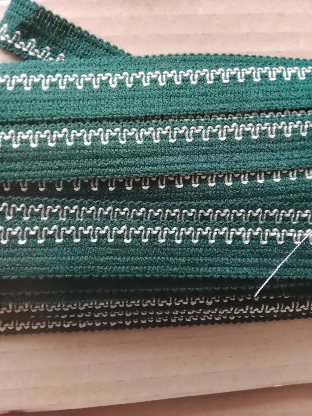 Cinta decorativa de color verde oscuro con un borde blanco trenzado. Ideal para manualidades, costura o decoración.