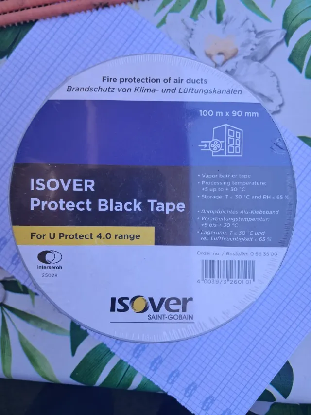 Detalles del productoCinta Isover Protect Black Tape para protección contra incendios de conductos de aire.