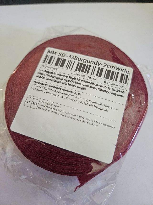 Cinta de raso de color burdeos, ideal para manualidades y decoración. - Color: Burdeos. - Ancho: 2 cm. - Longitud: 22 metros. E101