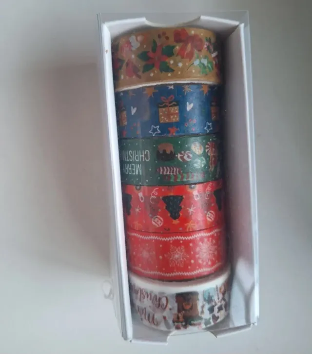 Set de cintas washi con motivos navideños. - Diseños variados de temática festiva. - Ideal para manualidades y decoración.