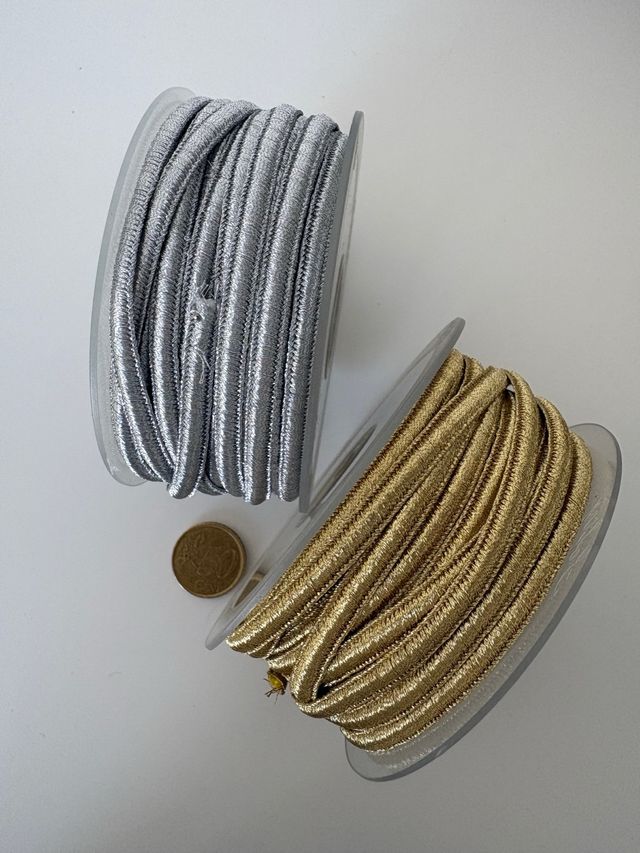 Detalles del productoDos rollos de cintas decorativas de 5mm de grosor, uno plateado y otro dorado. Perfectas para manualidades, costura y adornos.