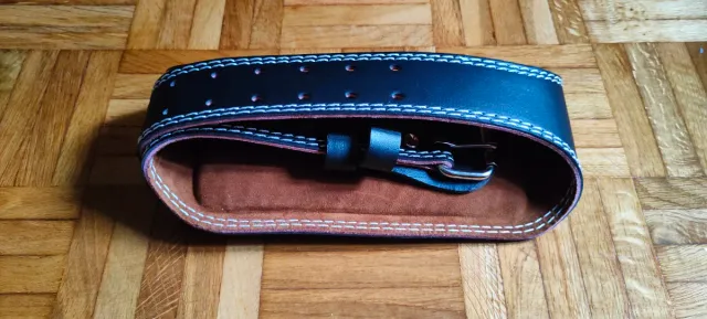 Cinturón de cuero negro para culturismo, levantamiento de pesas, gimnasio. - Doble costura blanca. - Hebilla metálica. - Interior de ante marrón.