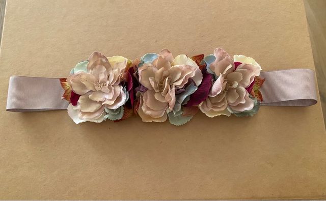 Cinturón de flores secas de la marca Nana Golmar. Colores beige, rosa empolvado, rojo y verde. Comprado en la tienda By Biombo.