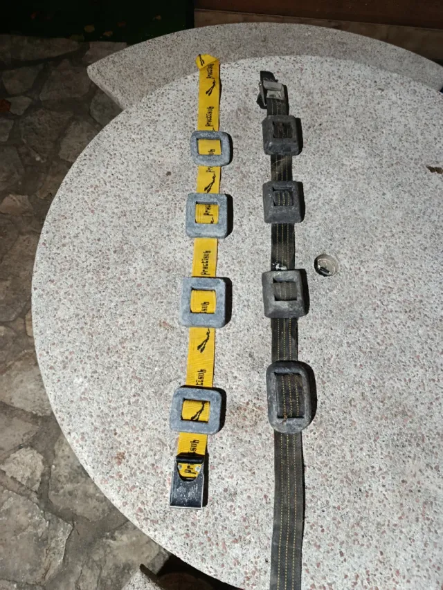 Cinturón de plomos para buceo, con dos opciones de correa. - Correa amarilla con texto Prosub y 5 plomos. - Correa negra con 4 plomos.