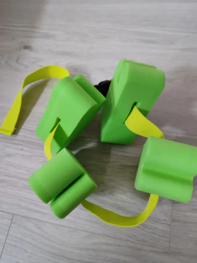 Detalles del productoCinturón de flotación para ayudar a los niños a aprender a nadar. Es de color verde brillante y tiene correas amarillas.