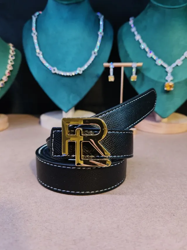 Detalles del productoElegante cinturón negro con costuras blancas y una distintiva hebilla dorada con las iniciales LR.