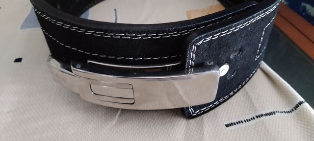 Cinturón de powerlifting con cierre de palanca, ideal para entrenamientos de gimnasio. Talla L ajustable - Color negro. - Cierre de palanca metálico.