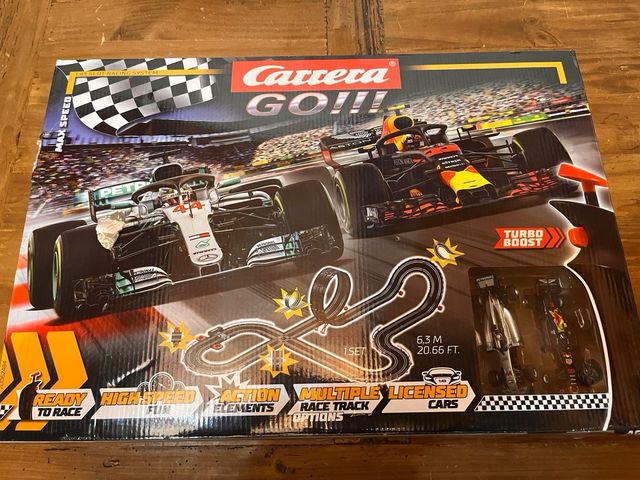 Circuito de carreras Scalextric Carrera Go. - Incluye dos coches de F1. - Pista con loop y curvas. - Barreras de protección.