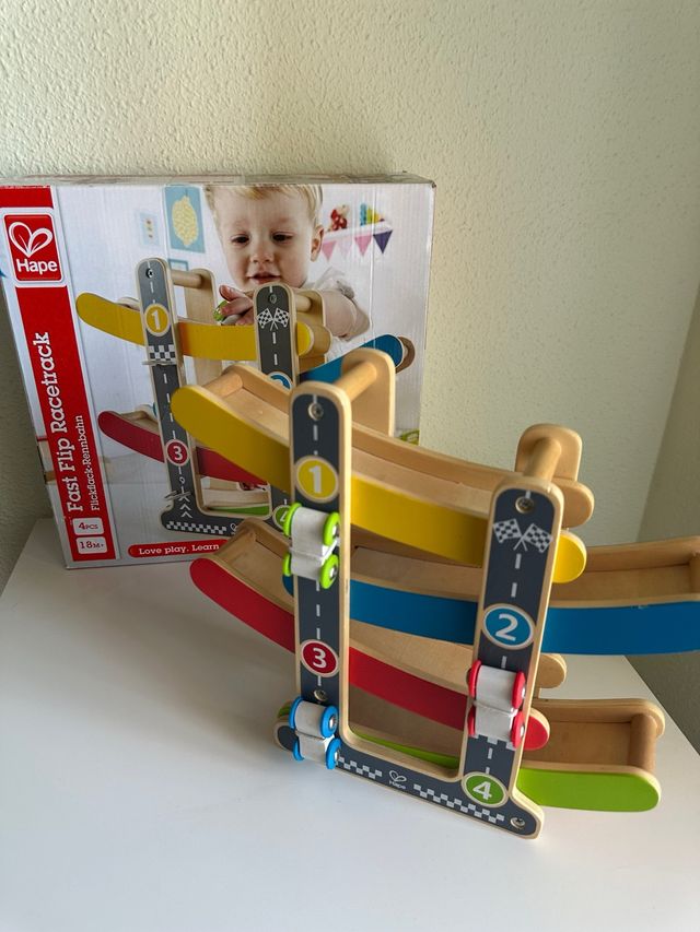 Detalles del productoEs un juguete de madera con una pista de carreras y tres coches incluidos.