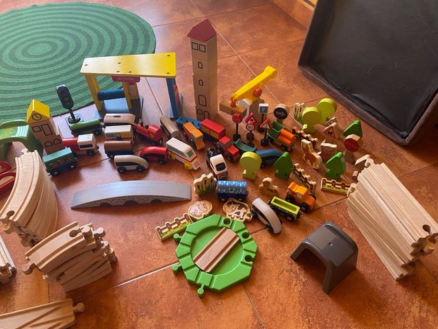 Detalles del productoPiezas de madera para construír diferentes circuitos de tren.Incluye figuras de animales,señales,trenes,tren que se mueve con pilas,semáforo que funciona a pilas,figuras de casas,árboles,puentes.Más de 50 piezas.