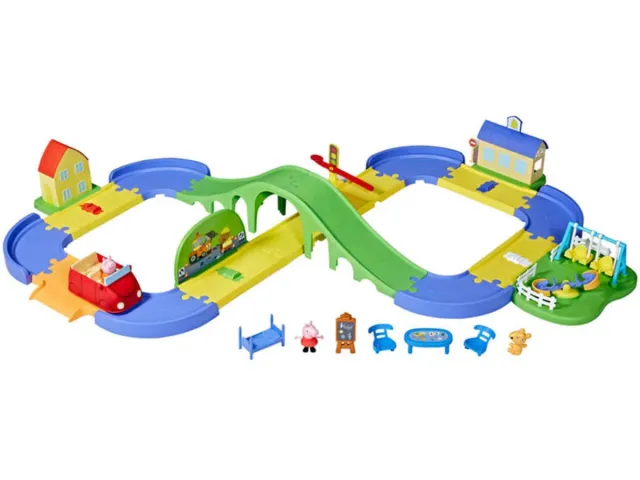 Divertido circuito de Peppa Pig para horas de juego. Tiene una pista ajustable que puede armarse de diferentes maneras para que el recorrido por la ciudad de Peppa sea diferente cada vez. Viene con un coche de Mamá Pig de color rojo y una figura removible de Peppa.