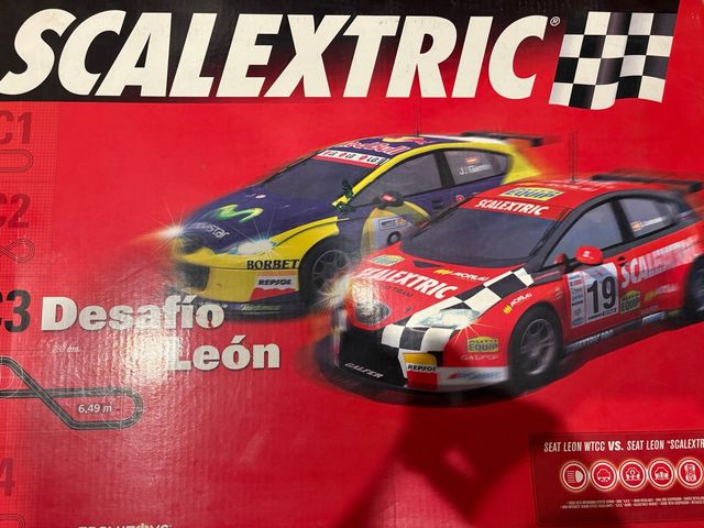 Detalles del productoCircuito de Scalextric de la marca TecniToys, modelo Desafío León C3. Incluye dos coches.