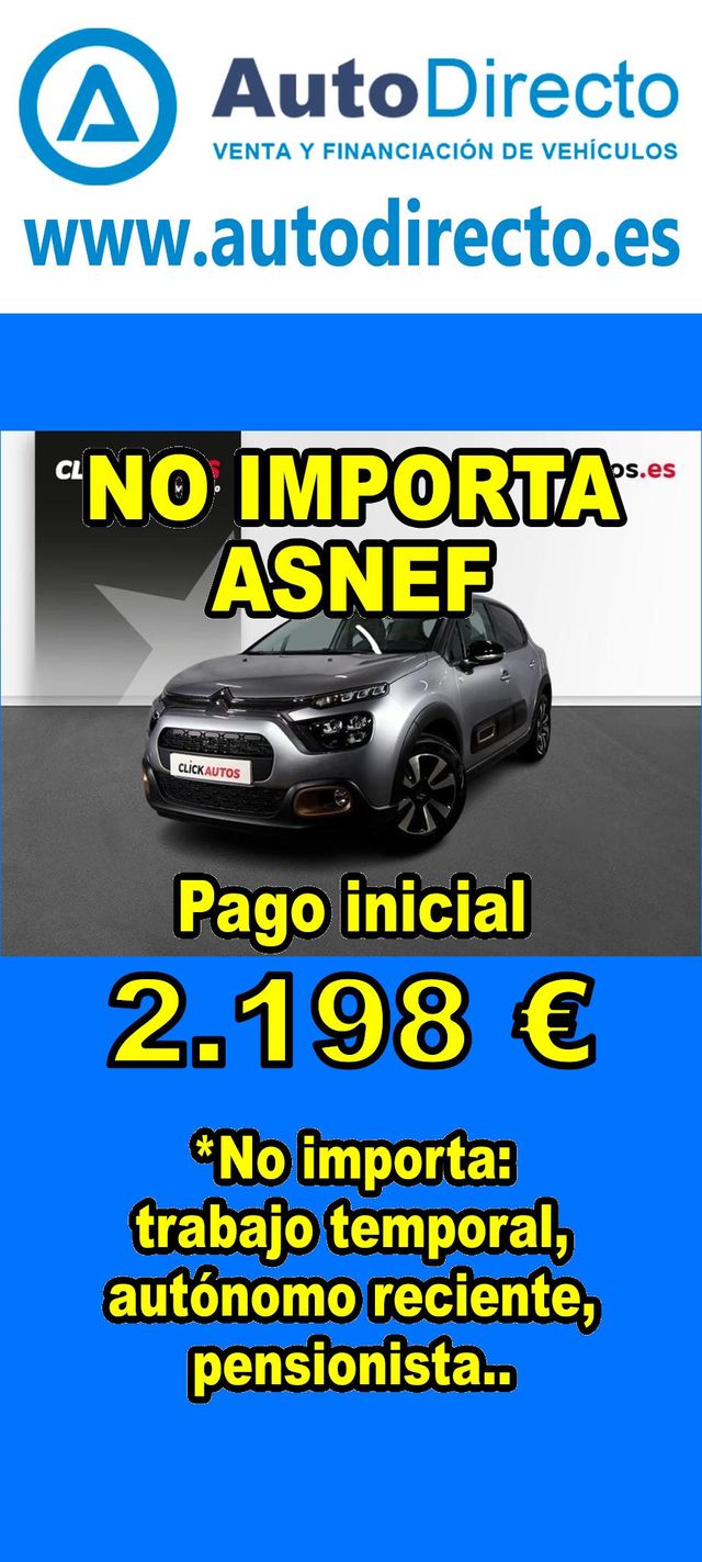 Detalles del producto¿No consigues financiación? ¡Tenemos la solución! RENT CREDIT (Alquiler con opción a compra) *************************************************************************** Aprobamos más del 90% de las operaciones. No importa ASNEF o RAI, impagos pendientes, ser autónomo o empresa reciente, ser pensionista. Imprescindible aportación inicial del 20%. Ejemplo de operación: CITROEN C3 1.2 83CV C-SERIES. Ref. W959031MDC - Precio vehículo: 10990 €. - Aportación inicial de 2198 €. - Cuota mes desde 234 €. - Impuesto de circulación y garantía de 1 año incluidos. *************************************************************************** ✅ Más de 3.000 VEHÍCULOS EN STOCK. ✅ Kilómetros certificados. ✅ 17 concesionarios repartidos en toda España. ♻️ Aceptamos tu coche como parte de la operación. *************************************************************************** IMPORTANTE: -. Este anuncio, no es vinculante, puede contener errores. SE MUESTRAN A TÍTULO INFORMATIVO Y NO CONTRACTUAL. -. Consultar disponibilidad del vehículo y datos exactos: fecha de matriculación, importes, etc,... *************************************************************************** Te ofrecemos distintas opciones: Venta al contado, financiación, renting, RENT CREDIT (Alquiler con opción a compra).