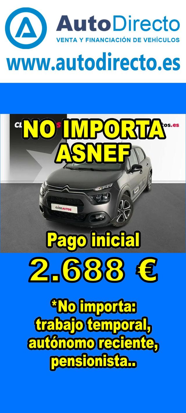 Detalles del producto¿No consigues financiación? ¡Tenemos la solución! RENT CREDIT (Alquiler con opción a compra) *************************************************************************** Aprobamos más del 90% de las operaciones. No importa ASNEF o RAI, impagos pendientes, ser autónomo o empresa reciente, ser pensionista. Imprescindible aportación inicial del 20%. Ejemplo de operación: CITROEN C3 1.2 83CV PLUS. Ref. W957250MPY - Precio vehículo: 13440 €. - Aportación inicial de 2688 €. - Cuota mes desde 284 €. - Impuesto de circulación y garantía de 1 año incluidos. *************************************************************************** ✅ Más de 3.000 VEHÍCULOS EN STOCK. ✅ Kilómetros certificados. ✅ 17 concesionarios repartidos en toda España. ♻️ Aceptamos tu coche como parte de la operación. *************************************************************************** IMPORTANTE: -. Este anuncio, no es vinculante, puede contener errores. SE MUESTRAN A TÍTULO INFORMATIVO Y NO CONTRACTUAL. -. Consultar disponibilidad del vehículo y datos exactos: fecha de matriculación, importes, etc,... *************************************************************************** Te ofrecemos distintas opciones: Venta al contado, financiación, renting, RENT CREDIT (Alquiler con opción a compra).