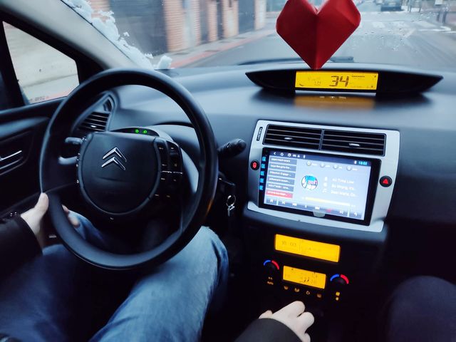 Lleva una tablet android de gran tamaño con navegador gps, cámara trasera, manos libres, etc.