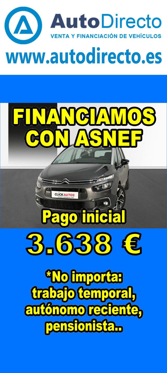 Detalles del producto¿No consigues financiación? ¡Tenemos la solución! *************************************************************************** RENT CREDIT: Aprobamos más del 90% de las operaciones. No importa ASNEF o RAI, impagos pendientes, ser autónomo o empresa reciente, ser pensionista. Imprescindible pago inicial del 20%. Ejemplo de operación: CITROEN GRAND C4 SPACETOURER 1.5 BLUEHDI 130CV C-SERIES. Ref. W956498LYG - Precio vehículo financiado: 18190 €. - Pago inicial de 3638 €. - Cuota mes desde 381 €. - Impuesto de circulación y garantía (mínimo 1 año) incluidos. *************************************************************************** ✅ Más de 3.000 COCHES Y FURGONETAS EN STOCK. ✅ HASTA 2 AÑOS DE GARANTIA. ✅ Kilómetros certificados. ✅ 17 concesionarios repartidos en toda España. ♻️ Aceptamos tu coche como parte del pago. *************************************************************************** IMPORTANTE: -. Este anuncio, no es vinculante, puede contener errores. SE MUESTRAN A TÍTULO INFORMATIVO Y NO CONTRACTUAL. -. Consultar disponibilidad del vehículo y datos exactos: fecha de matriculación, importes, etc,... *************************************************************************** Te ofrecemos distintas opciones: financiación, renting, alquiler con opción a compra, rent credit. En nuestro stock disponible encontraras: 3008 , qashqai , corolla , rav4 , sandero , Duster , yaris , 2008 , Tucson , Ibiza , 208 , Sportage , a3 , c4 , Formentor , q3 , yaris cross , 500 , c3 , arona , zs , x1 , kona , corsa , clase a , león , 308 , serie 1 , golf , focus , captur , a1 , tiguan , i20 , t roc , stonic , xc40 , civic , q5 , serie 3 , glb , 5008 , ateca , clio , kuga , c hr , i30 , arkana , juke , a4 , x3 , cx 5 , xc60 , kamiq , taigo , Mustang , x6 , polo , ceed , karoq , x2 , Astra , niro , cx 30 , a5 , cooper , megane , moka , fiesta , hs , q2 , clase c , serie 3 , renegade , picanto.