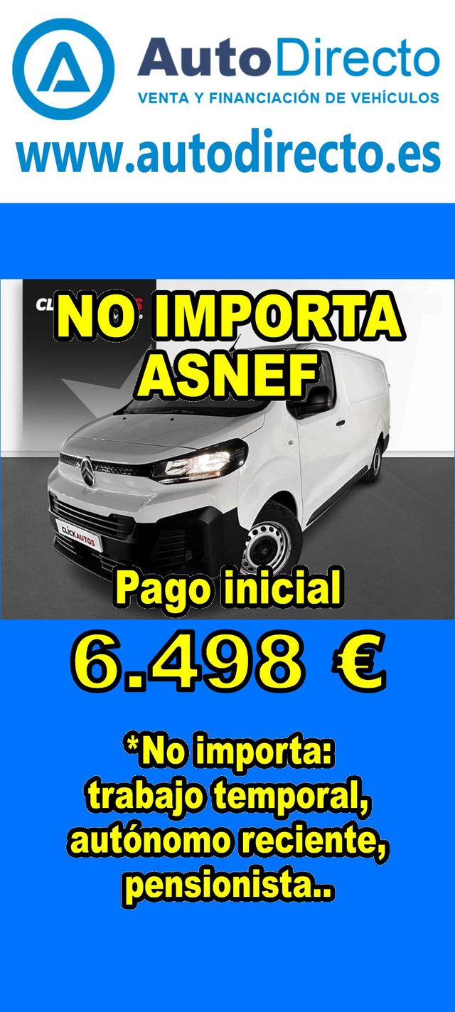 Detalles del producto¿No consigues financiación? ¡Tenemos la solución! RENT CREDIT (Alquiler con opción a compra) *************************************************************************** Aprobamos más del 90% de las operaciones. No importa ASNEF o RAI, impagos pendientes, ser autónomo o empresa reciente, ser pensionista. Imprescindible aportación inicial del 20%. Ejemplo de operación: CITROEN JUMPY 2.0 BLUEHDI 145CV FURGON TALLA XL EAT8. Ref. W953298MSV - Precio vehículo: 32490 €. - Aportación inicial de 6498 €. - Cuota mes desde 672 €. - Impuesto de circulación y garantía de 1 año incluidos. *************************************************************************** ✅ Más de 3.000 VEHÍCULOS EN STOCK. ✅ Kilómetros certificados. ✅ 17 concesionarios repartidos en toda España. ♻️ Aceptamos tu coche como parte de la operación. *************************************************************************** IMPORTANTE: -. Este anuncio, no es vinculante, puede contener errores. SE MUESTRAN A TÍTULO INFORMATIVO Y NO CONTRACTUAL. -. Consultar disponibilidad del vehículo y datos exactos: fecha de matriculación, importes, etc,... *************************************************************************** Te ofrecemos distintas opciones: Venta al contado, financiación, renting, RENT CREDIT (Alquiler con opción a compra).
