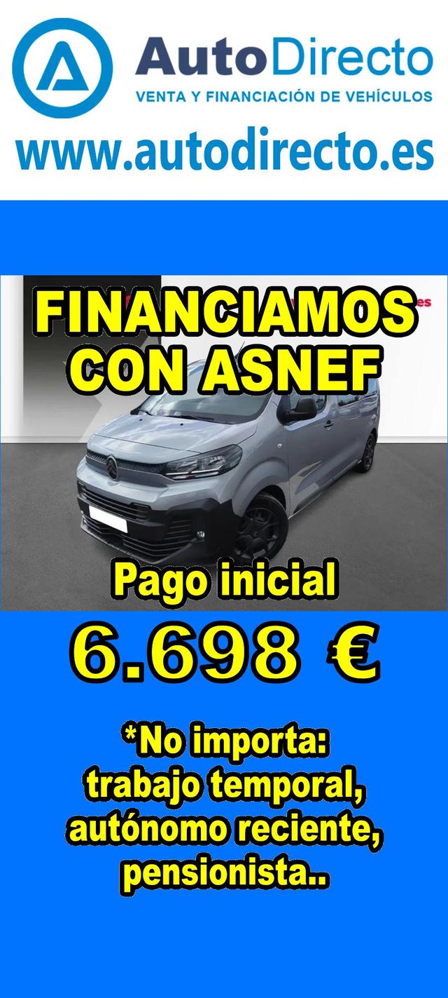 Detalles del producto¿No consigues financiación? ¡Tenemos la solución! *************************************************************************** RENT CREDIT: Aprobamos más del 90% de las operaciones. No importa ASNEF o RAI, impagos pendientes, ser autónomo o empresa reciente, ser pensionista. Imprescindible pago inicial del 20%. Ejemplo de operación: CITROEN JUMPY 2.0 BLUEHDI 180CV COMBI TALLA M EAT8 9 PL. Ref. W958985MVF - Precio vehículo: 33490 €. - Pago inicial de 6698 €. - Cuota mes desde 692 €. - Impuesto de circulación y garantía (mínimo 1 año) incluidos. *************************************************************************** ✅ Más de 3.000 COCHES Y FURGONETAS EN STOCK. ✅ HASTA 2 AÑOS DE GARANTIA. ✅ Kilómetros certificados. ✅ 17 concesionarios repartidos en toda España. ♻️ Aceptamos tu coche como parte del pago. *************************************************************************** IMPORTANTE: -. Este anuncio, no es vinculante, puede contener errores. SE MUESTRAN A TÍTULO INFORMATIVO Y NO CONTRACTUAL. -. Consultar disponibilidad del vehículo y datos exactos: fecha de matriculación, importes, etc,... *************************************************************************** Te ofrecemos distintas opciones: financiación, renting, alquiler con opción a compra, rent credit. En nuestro stock disponible encontraras: 3008 , qashqai , corolla , rav4 , sandero , Duster , yaris , 2008 , Tucson , Ibiza , 208 , Sportage , a3 , c4 , Formentor , q3 , yaris cross , 500 , c3 , arona , zs , x1 , kona , corsa , clase a , león , 308 , serie 1 , golf , focus , captur , a1 , tiguan , i20 , t roc , stonic , xc40 , civic , q5 , serie 3 , glb , 5008 , ateca , clio , kuga , c hr , i30 , arkana , juke , a4 , x3 , cx 5 , xc60 , kamiq , taigo , Mustang , x6 , polo , ceed , karoq , x2 , Astra , niro , cx 30 , a5 , cooper , megane , moka , fiesta , hs , q2 , clase c , serie 3 , renegade , picanto.