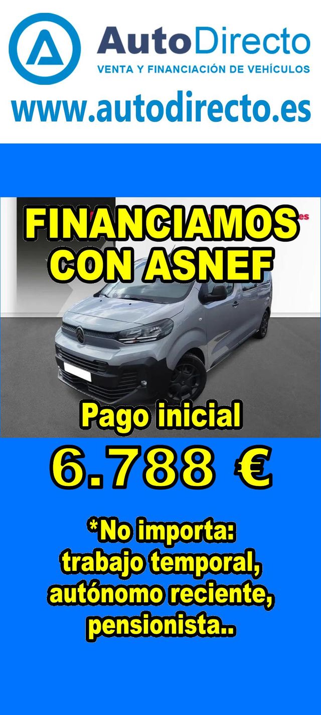 Detalles del producto¿No consigues financiación? ¡Tenemos la solución! *************************************************************************** RENT CREDIT: Aprobamos más del 90% de las operaciones. No importa ASNEF o RAI, impagos pendientes, ser autónomo o empresa reciente, ser pensionista. Imprescindible pago inicial del 20%. Ejemplo de operación: CITROEN JUMPY 2.0 BLUEHDI 180CV COMBI TALLA M EAT8 9 PL. Ref. W958989MVF - Precio vehículo: 33940 €. - Pago inicial de 6788 €. - Cuota mes desde 702 €. - Impuesto de circulación y garantía (mínimo 1 año) incluidos. *************************************************************************** ✅ Más de 3.000 COCHES Y FURGONETAS EN STOCK. ✅ HASTA 2 AÑOS DE GARANTIA. ✅ Kilómetros certificados. ✅ 17 concesionarios repartidos en toda España. ♻️ Aceptamos tu coche como parte del pago. *************************************************************************** IMPORTANTE: -. Este anuncio, no es vinculante, puede contener errores. SE MUESTRAN A TÍTULO INFORMATIVO Y NO CONTRACTUAL. -. Consultar disponibilidad del vehículo y datos exactos: fecha de matriculación, importes, etc,... *************************************************************************** Te ofrecemos distintas opciones: financiación, renting, alquiler con opción a compra, rent credit. En nuestro stock disponible encontraras: 3008 , qashqai , corolla , rav4 , sandero , Duster , yaris , 2008 , Tucson , Ibiza , 208 , Sportage , a3 , c4 , Formentor , q3 , yaris cross , 500 , c3 , arona , zs , x1 , kona , corsa , clase a , león , 308 , serie 1 , golf , focus , captur , a1 , tiguan , i20 , t roc , stonic , xc40 , civic , q5 , serie 3 , glb , 5008 , ateca , clio , kuga , c hr , i30 , arkana , juke , a4 , x3 , cx 5 , xc60 , kamiq , taigo , Mustang , x6 , polo , ceed , karoq , x2 , Astra , niro , cx 30 , a5 , cooper , megane , moka , fiesta , hs , q2 , clase c , serie 3 , renegade , picanto.