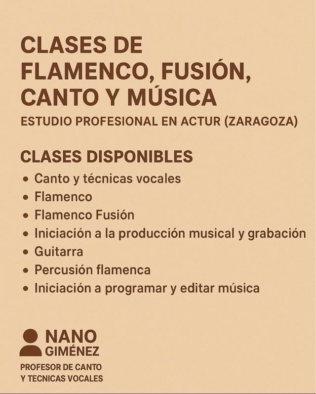 Detalles del productoCLASES DE FLAMENCO, FUSIÓN, CANTO Y MÚSICA – Estudio Profesional en Actur (Zaragoza)