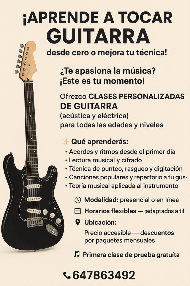 Ofrezco clases personalizadas de guitarra (acústica y eléctrica) para todas las edades y niveles.