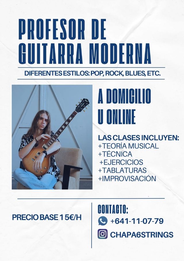 Clases de guitarra moderna (eléctrica/acústica). A domicilio u online Precio base 15€ hora (varía según el transporte etc)