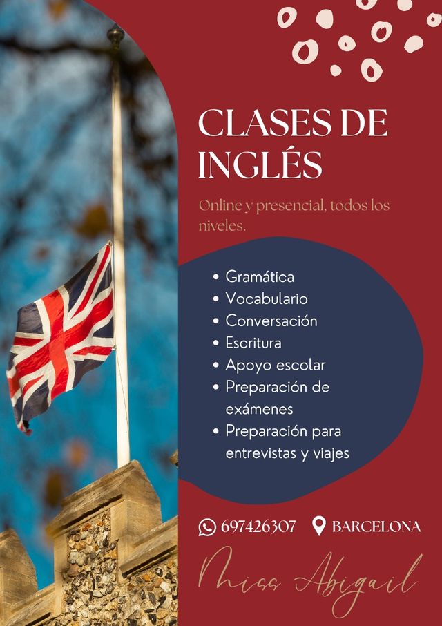 Detalles del productoHola 😊 me llamo Abi, soy profe de inglés y doy clases personalizadas para todas las edades y niveles. Mi idea es que aprendas de forma sencilla y práctica, con clases dinámicas adaptadas a lo que necesites: conversación, gramática, trabajo, viajes o exámenes.
