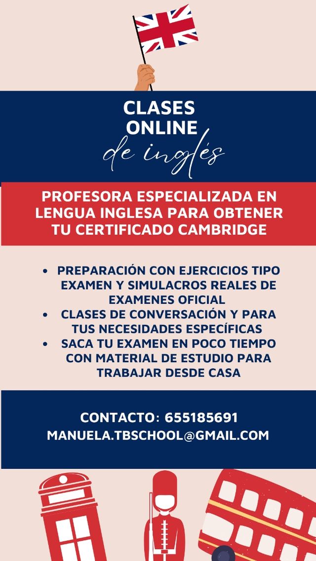 Detalles del productoClases particulares online de inglés para preparar tu certificado Cambridge. Profesora especializada en lengua inglesa, proactiva y con experiencia en clases personalizadas.