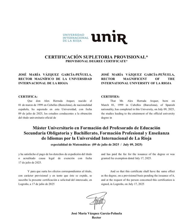 Graduado en Administración y dirección de empresas en la universidad de Barcelona y tengo el máster de formación del profesorado en matemáticas.
