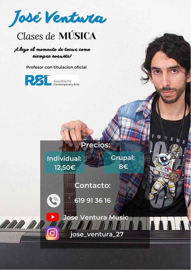 Detalles del productoLlegó el momento de tocar como siempre soñaste! Soy Jose, profesor particular con mas de 6 años de experiencia impartiendo clases y 1 año en colegios. Cuento con estuidos oficiales de música, experiencia en escenarios y soy miembro oficial de la orquesta Sinfonity, en 2024 lancé “Una Vuelta por el Universo de la Música”, un libro bilingüe de educacion musical infantil.Las clases son completamente a medida de cada alumno, para crecer en la Música de forma comoda. Para Guitarra, Piano, Bajo y Ukelele, desde aprender canciones hasta teoria.