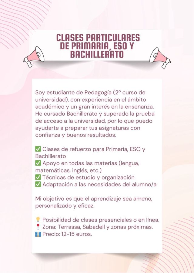 Detalles del productoSoy estudiante de Pedagogía (2º curso de universidad), con experiencia en el ámbito académico y un gran interés en la enseñanza. He cursado Bachillerato y superado la prueba de acceso a la universidad, por lo que puedo ayudarte a preparar tus asignaturas con confianza y buenos resultados.
