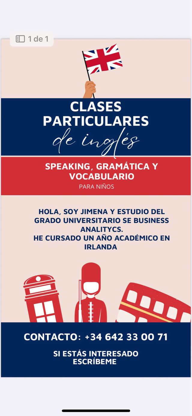 Detalles del productoSoy Jimena y desde siempre me ha encantado y he tenido una gran facilidad para inglés. Ahora busco compartir mis conocimientos sobre esta lengua con niños a los que les cuesta entenderla.