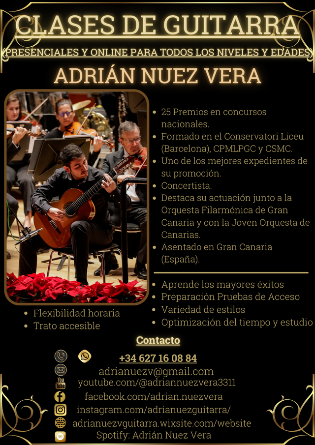 Detalles del productoClases de guitarra online y presenciales para todos los niveles y edades. Adrian Nuez Vera, con 25 premios nacionales y formación en conservatorios de prestigio, ofrece clases personalizadas.