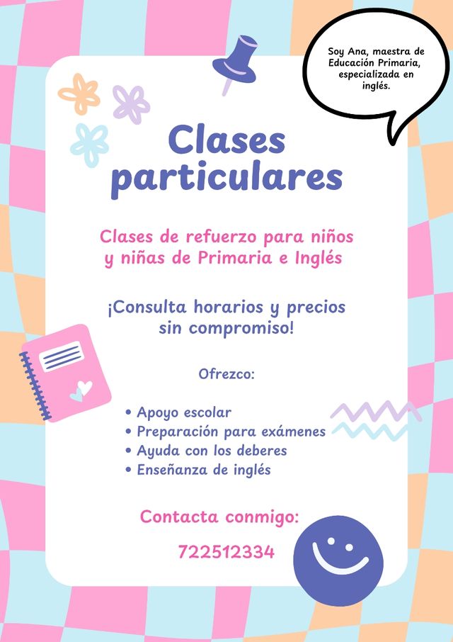 Soy Ana, maestra de Educación Primaria especializada en inglés, y ofrezco clases particulares de refuerzo adaptadas a cada niño/a.