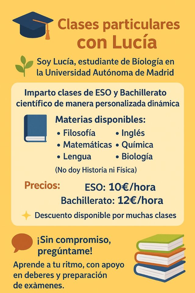 Ofrezco unas clases Dinámicas adaptadas a cada alumno en filosofía, lengua y literatura, matemáticas, inglés, química y SOBRETODO BIOLOGÍA.