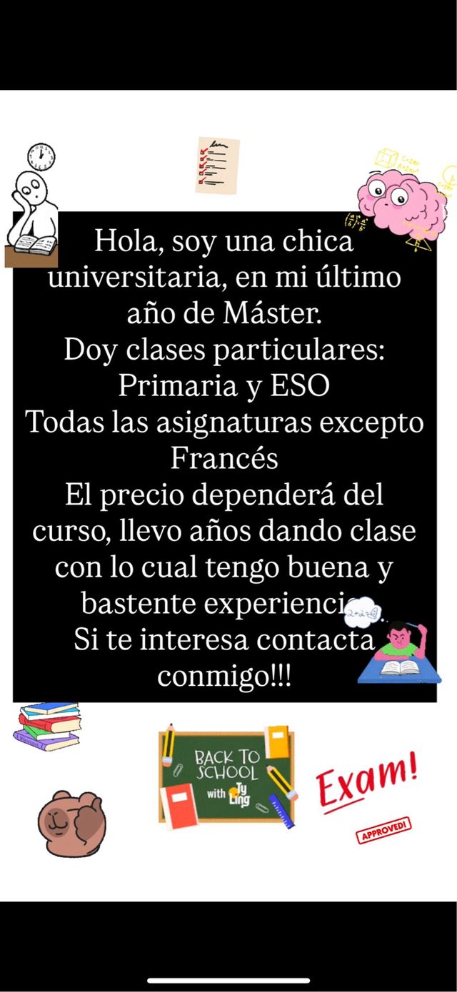Detalles del producto¡Hola! Soy una universitaria que está terminando su Máster y ofrezco clases particulares de todas las asignaturas de Primaria y ESO, excepto francés.
