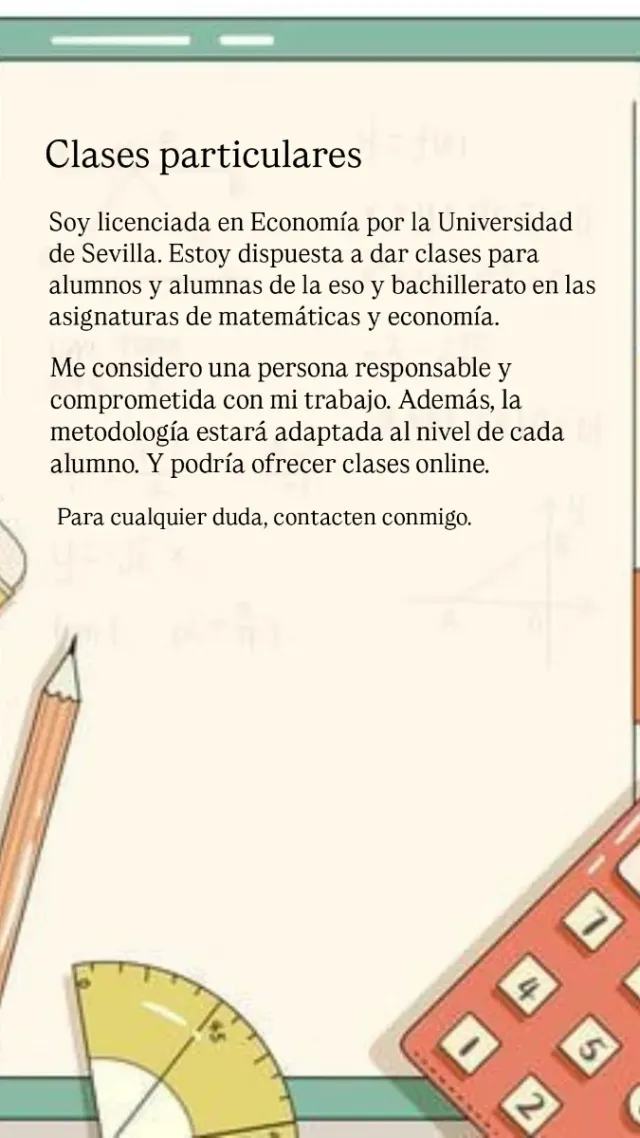 Ofrezco clases de apoyo en las asignaturas de matemáticas y economía.