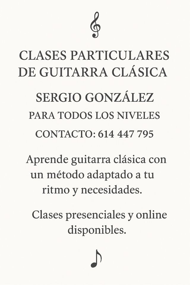 Doy clases de guitarra clásica a todos los niveles, apoyo de lenguaje musical y comienzos de guitarra flamenca.
