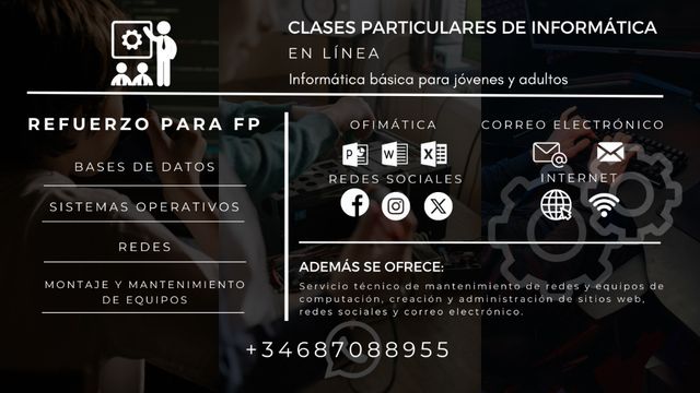 Clases particulares de informática, (DAM-DAW-ASIR-SMIR) Sistemas Operativos, Redes, Ofimática, mantenimiento de Equipos, Bases de datos, Apoyo FP