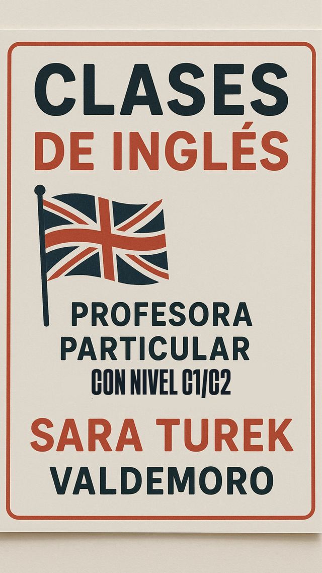 Detalles del productoMe presento: mi nombre es Sara Turek, tengo 19 años, resido en Valdemoro y soy una estudiante con nivel C1/C2 de inglés (aunque no certificado). Siempre se me ha dado muy bien el inglés y considero que puedo ser de buena ayuda para pequeños estudiantes de primaria o ESO que necesiten ayuda en inglés. No tengo experiencia como profesora pero soy una chica responsable y aplicada, dispuesta a amoldarme a las necesidades del alumno y a cualquier caso particular, y con muchas ganas de adquirir experiencia y de transmitir mis conocimientos de la mejor manera posible. Me traslado a domicilio en Valdemoro. Escriban para más información. 😊