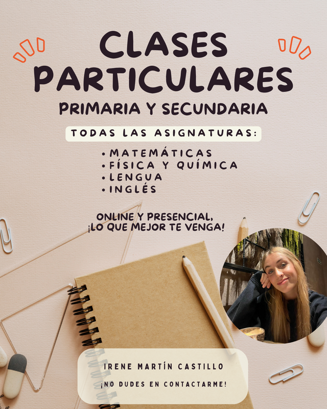 Detalles del productoSoy estudiante de último año de Ingeniería en Organización Industrial, con amplia experiencia dando clases durante toda mi carrera y una gran vocación por la enseñanza. Me encanta trabajar con niños y jóvenes, adaptando la explicación a cada alumno para que entienda y, sobre todo, disfrute aprendiendo.