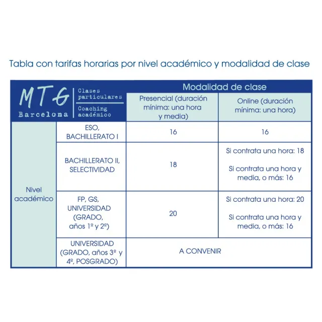 ACLARACIÓN IMPORTANTE – El precio de la hora de clase (‘tarifa horaria’) es A CONVENIR, en base al nivel académico del alumno, la modalidad de clase solicitada, y la ‘urgencia’ de la solicitud.