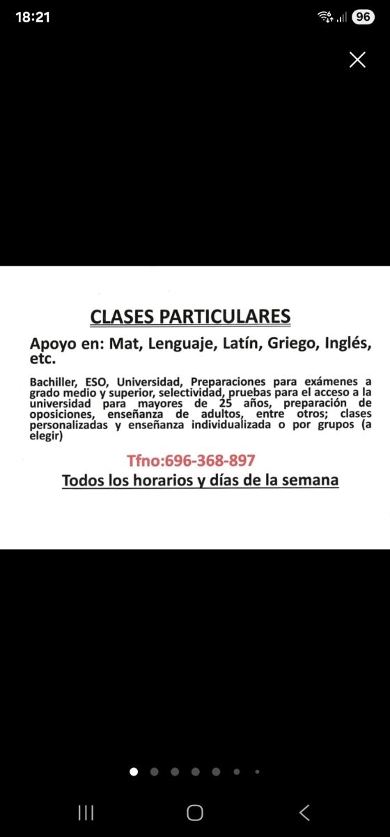 Profesora de universidad de más de 30 años de experiencia en la enseñanza. Clases particulares online. ESO, BACHILLER, CURSO INTENSIVO DE SELECTIVIDAD/EBAU, ACCESO A LA UNIVERSIDAD PARA MAYORES DE 25 Y 45 AÑOS, ACCESO A GRADO MEDIO Y SUPERIOR, UNIVERSIDAD, OPOSICIONES, FORMACIÓN PROFESIONAL (FP). CURSOS. Matemáticas, física, química, todas las asignaturas, letras, ciencias, tecnología, humanidades, etc. español para extranjeros. apoyo escolar y universitario. enseñanza individualizada o por grupos, a elegir. material didáctico a disposición del alumnad
