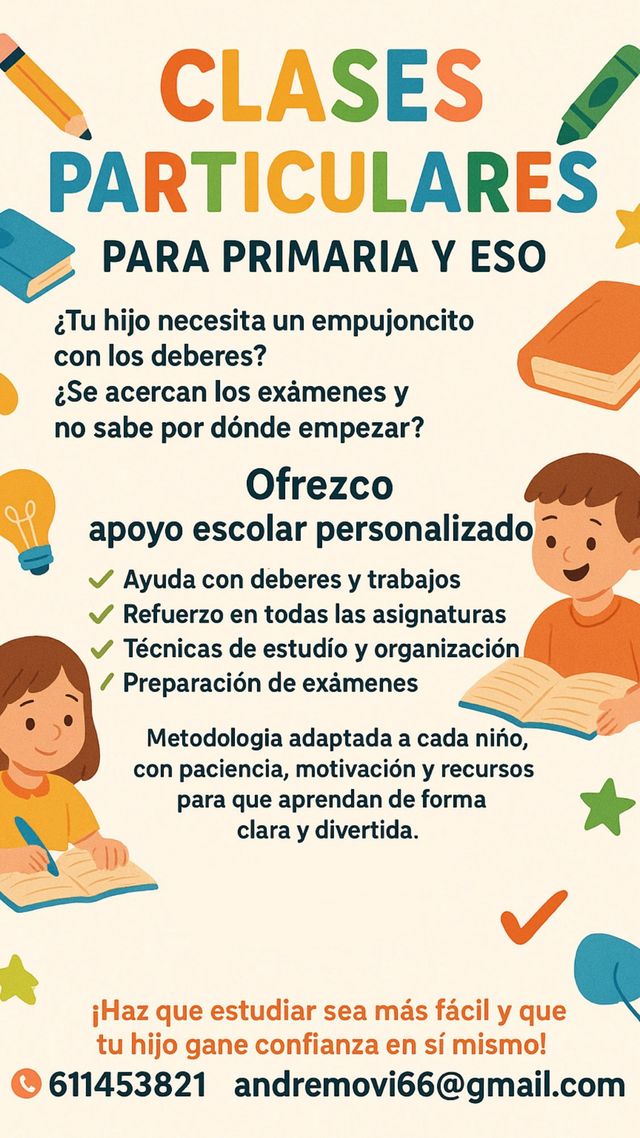 Detalles del productoHola!!! Me llamo Andrea y ofrezco clases particulares a domicilio a niños de primaria y la eso con el fin de ayudar a realizar deberes, trabajos y preparación de exámenes