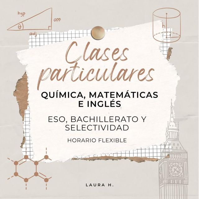 Ofrezco clases particulares de refuerzo para la ESO, bachillerato y preparación de EBAU en las asignaturas de química, matemáticas e inglés.