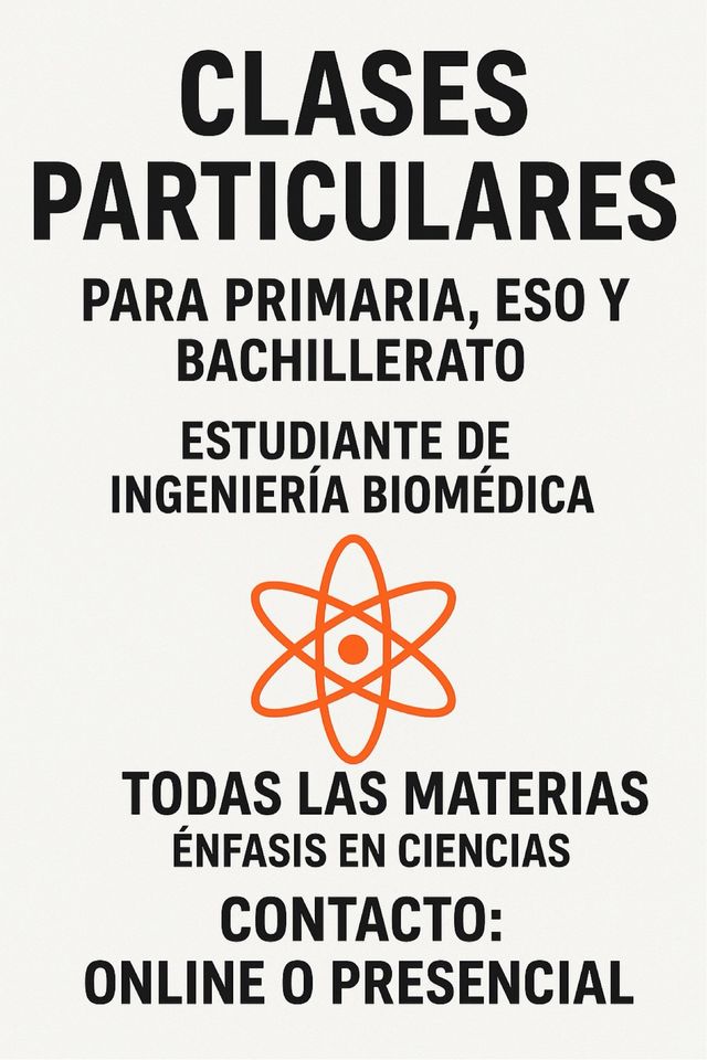 Detalles del productoSoy estudiante de Ingeniería Biomédica y ofrezco clases particulares para alumnos de Primaria, ESO y Bachillerato. Me especializo en materias de ciencias como matemáticas, física, química y biología, aunque también puedo ayudar con el resto de asignaturas (excepto idiomas).